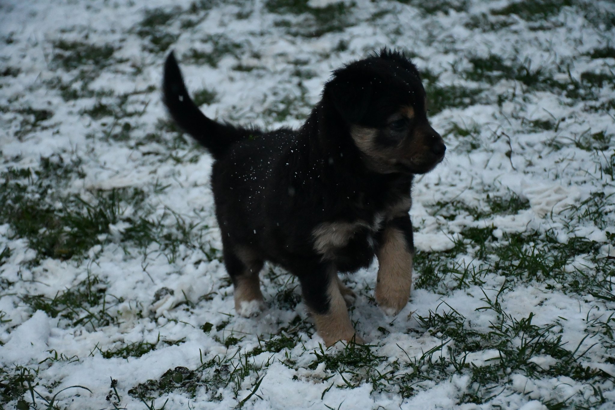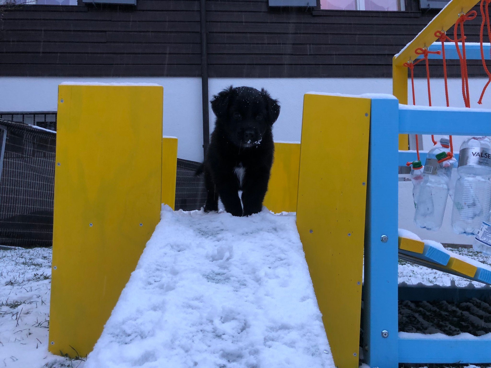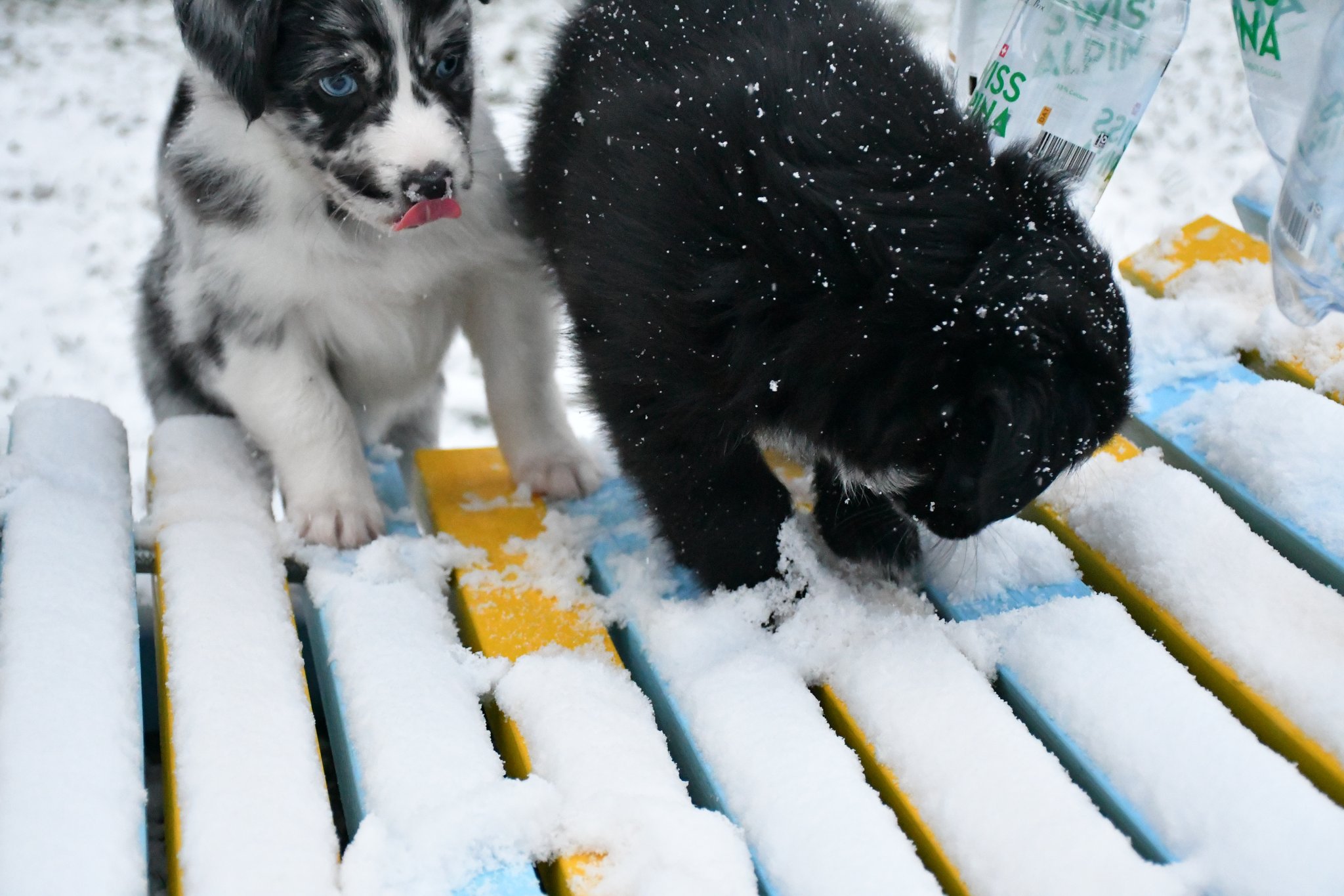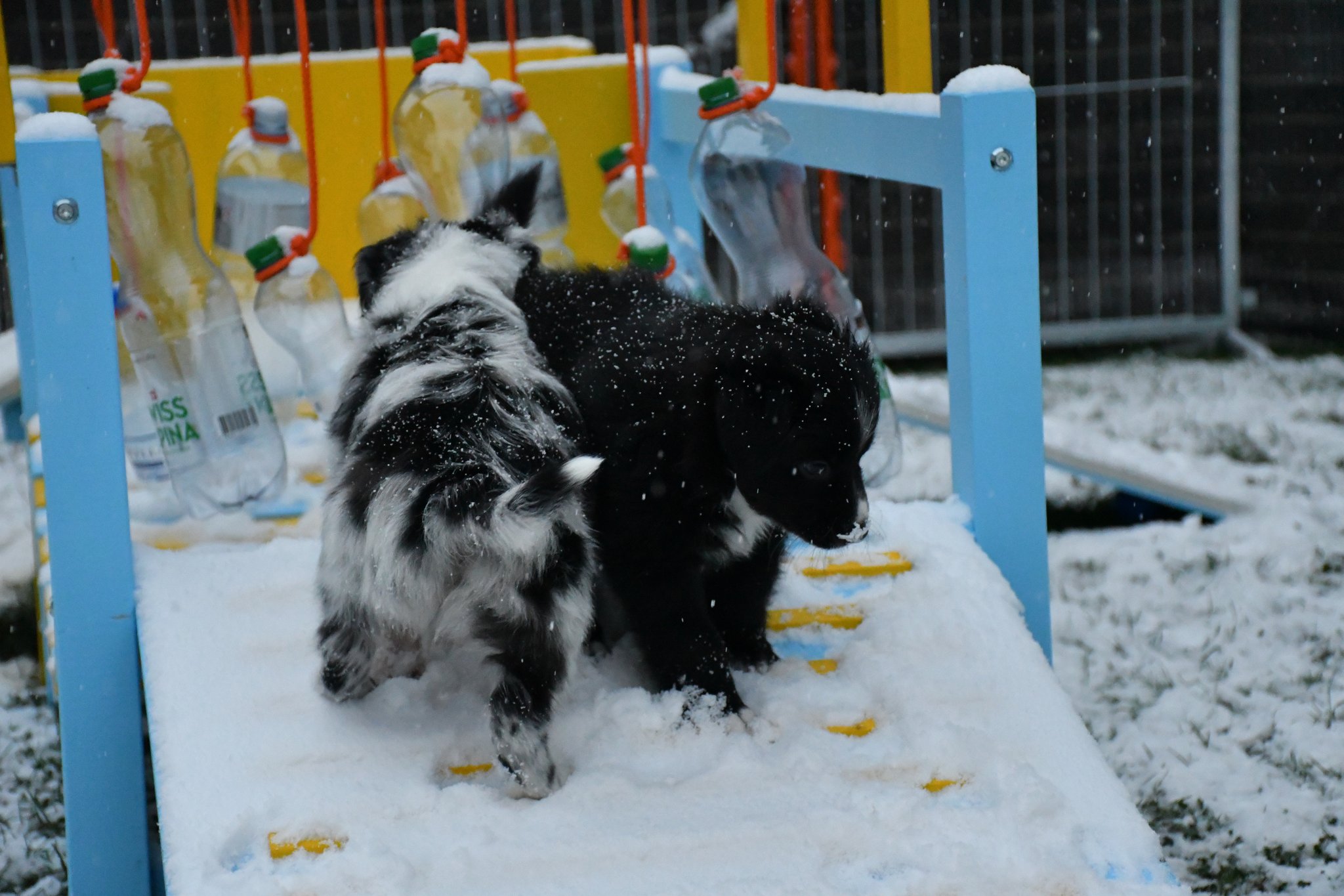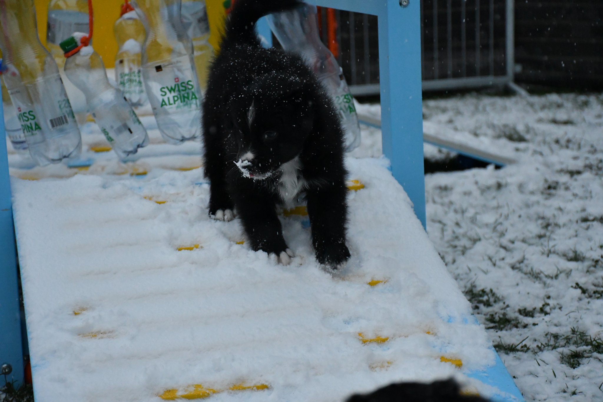 Eisplatten schlecken, gefrorenes Gras fressen, glatte Holzplanken erkunden - die Welpen müssen gut überwacht werden...
