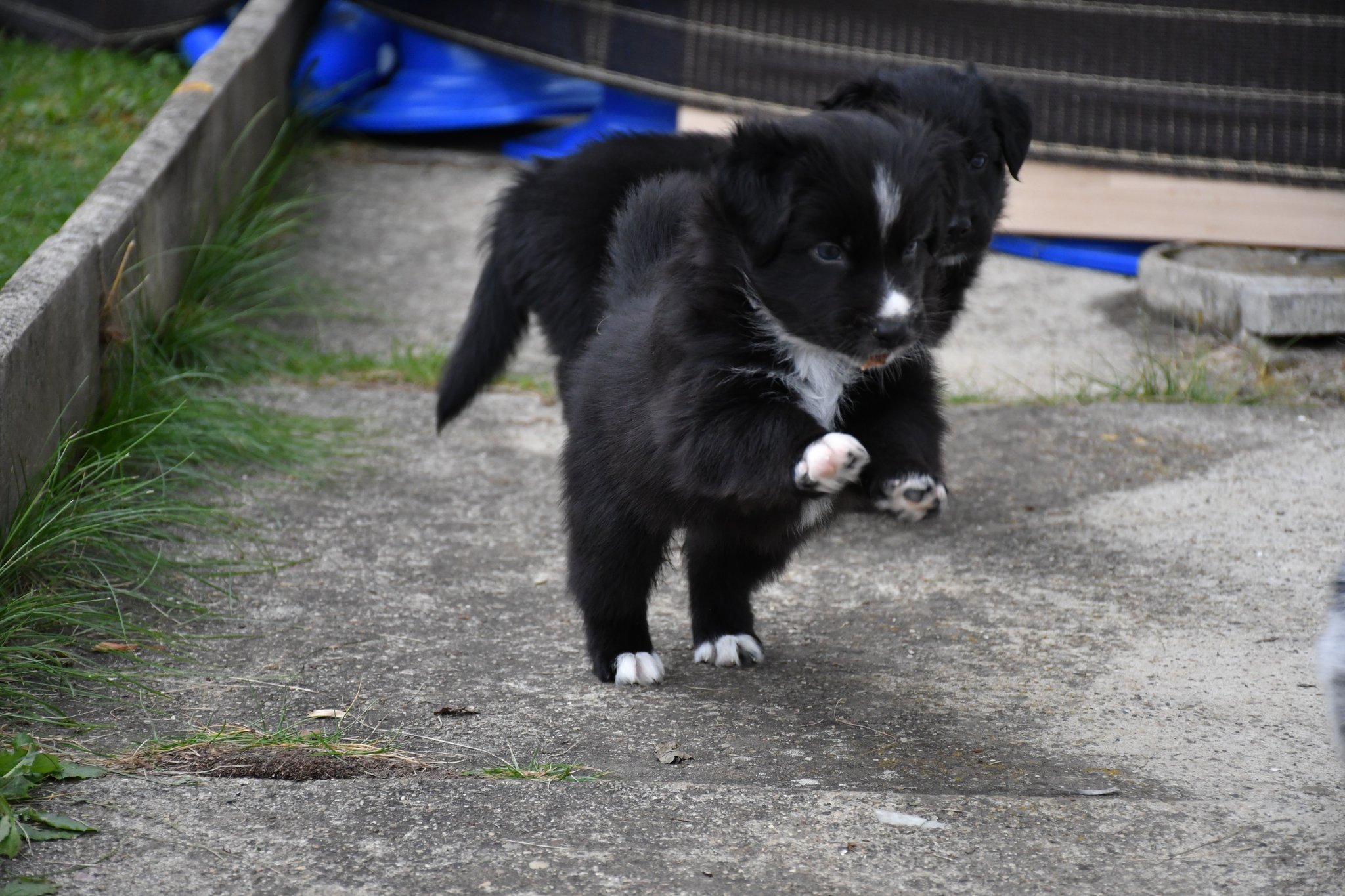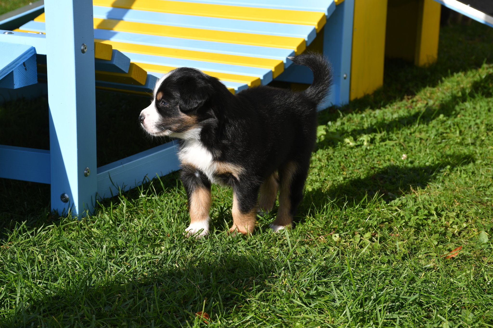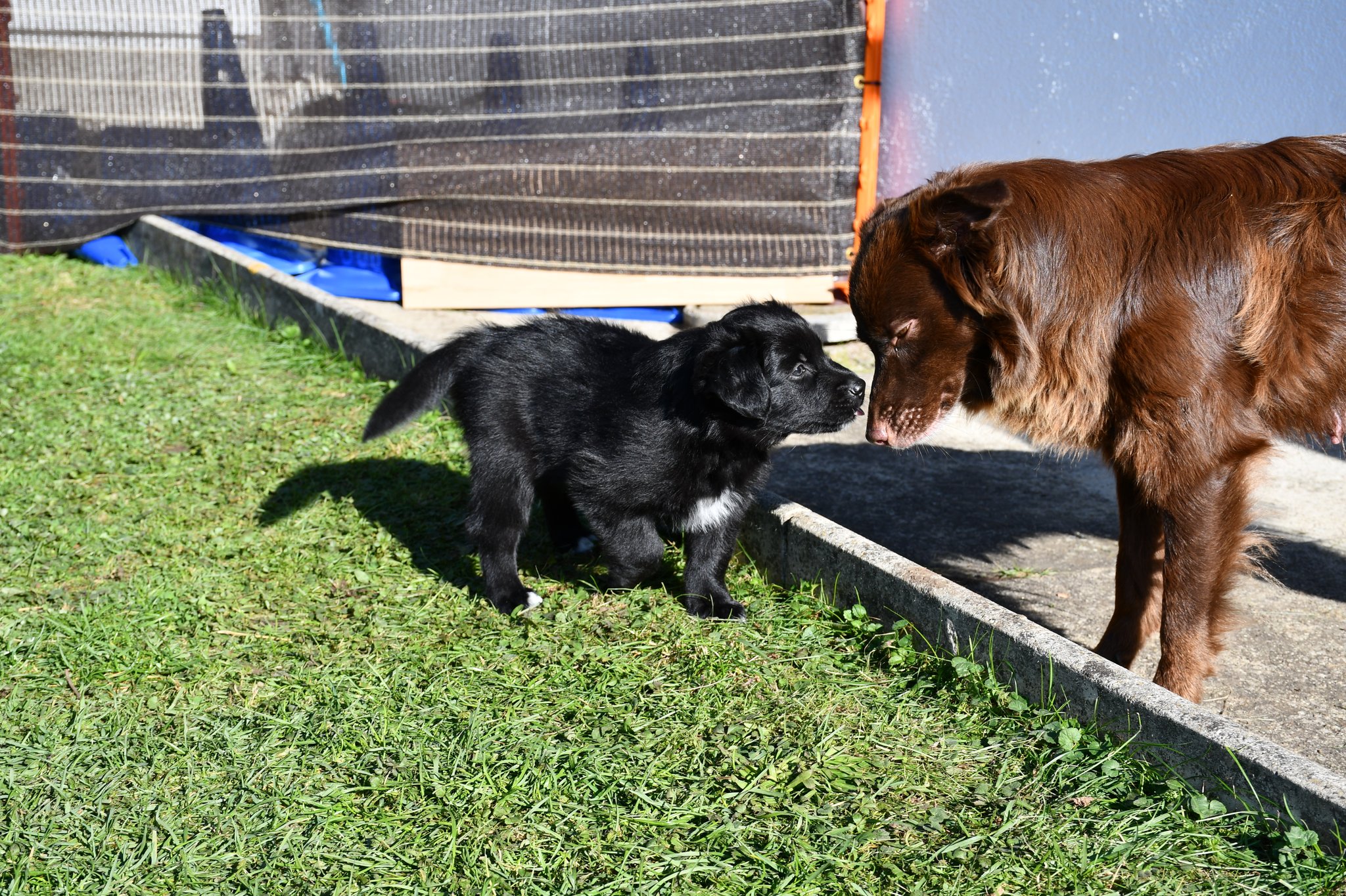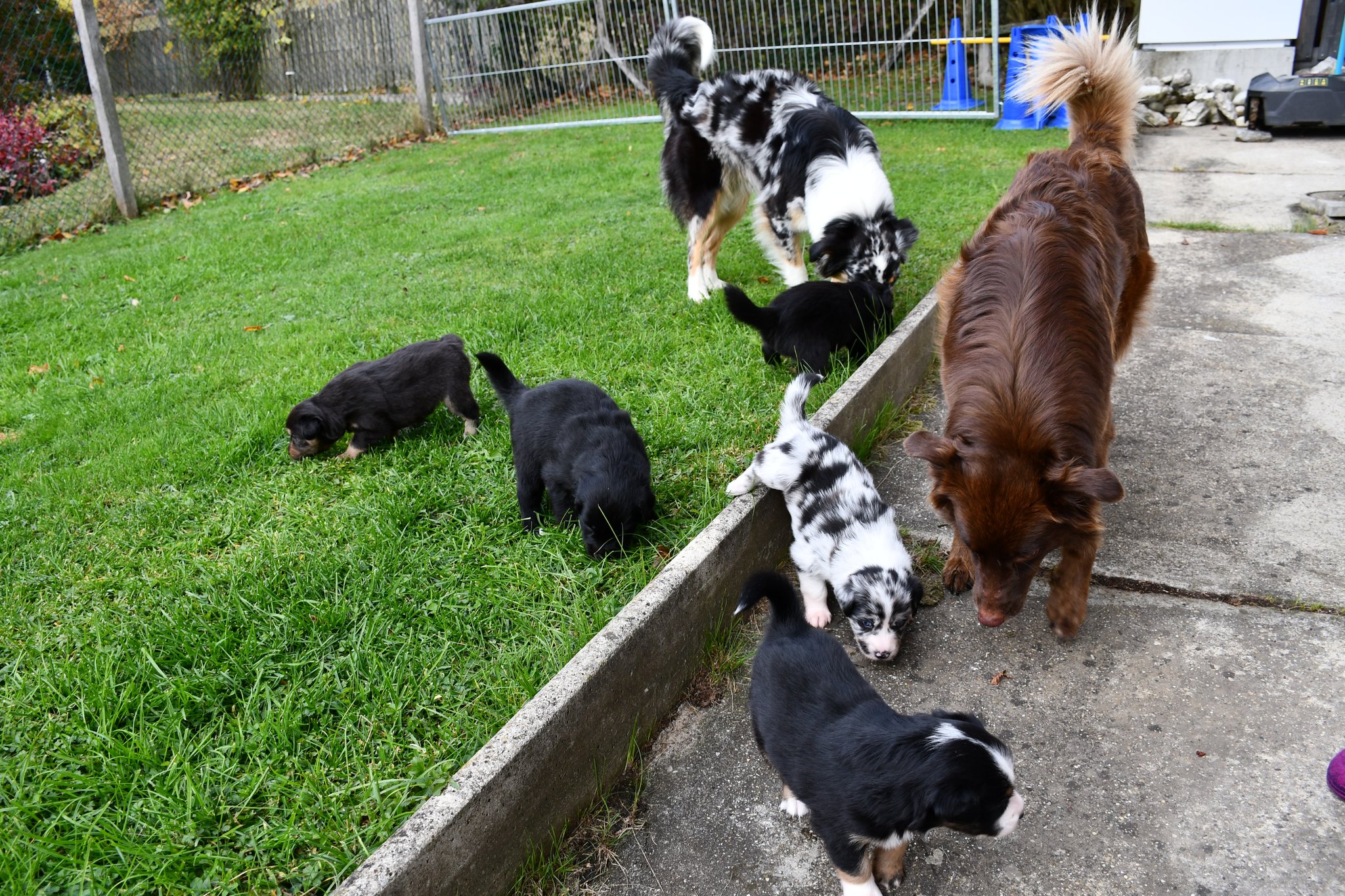 Unsere Züchter haben extra ein paar Quadratmeter Rasen des sonst trockenen und braunen Gartens gewässert und gehätschelt. Jetzt geniessen wir das fette und kitzlige Gras und andere Bodenbeläge. Und wir schiessen tolle Fotos :-)