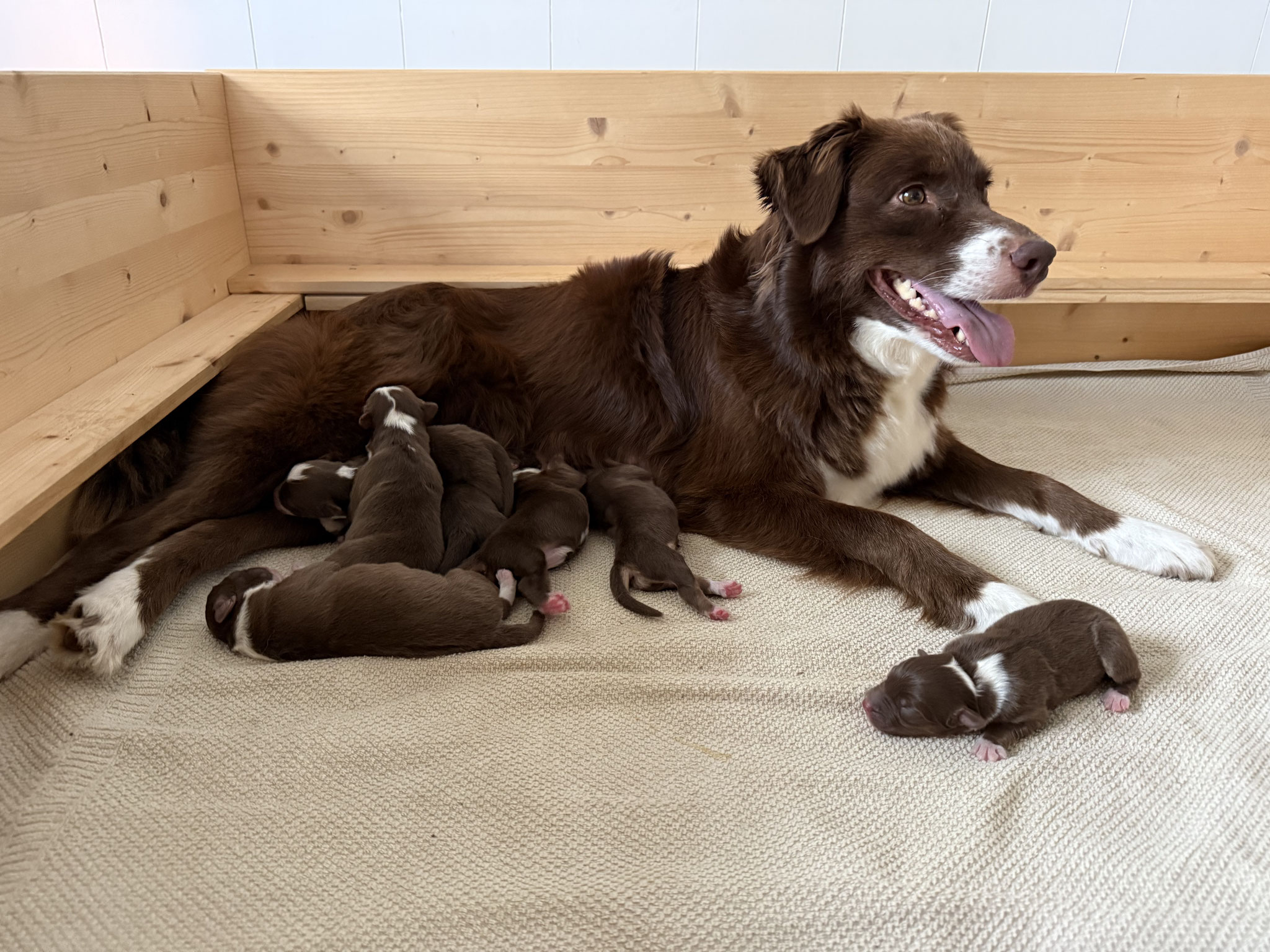 stammt aus unserer eigenen Zucht und ist unser Schmusebär. Zuhause sehr ruhig und verschmust, auf dem Agi Platz gibt sie jedoch so richtig Gas. Ihr moderates Exterieur erlaubt ihr enge Wendungen und eine sehr gute Sprungtechnik. Auch im Obedience und Rallye Obedience ist sie allzeit bereit und man muss sie eher bremsen als motivieren. Sie arbeitet fürs Leben gern und hat einen perfekten On/Off Knopf. Sie ist sehr sozial in unserem Rudel und eine tolle Mutter, die uns 13 tolle Welpen geschenkt hat. Fremden gegenüber ist sie aussietypisch eher reserviert.